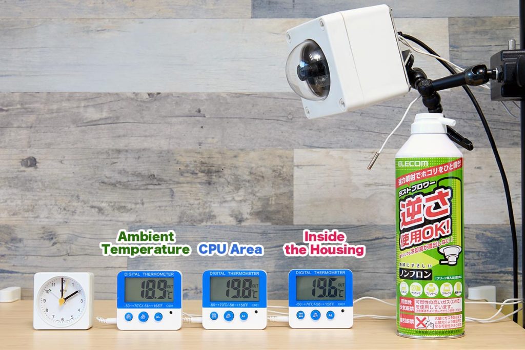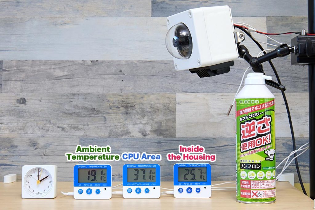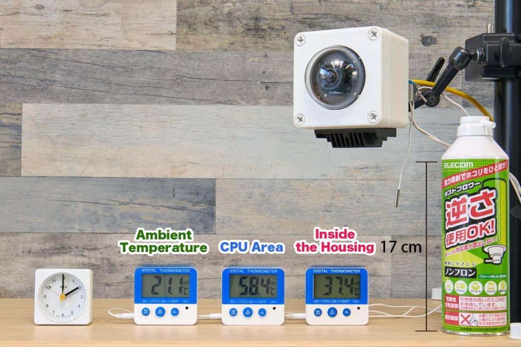 A camera was installed inside the camera housing, and the cooling performance of the sealed-case cooling system (Entaniya Silent Mount 315) was evaluated.