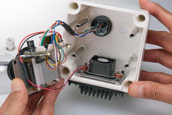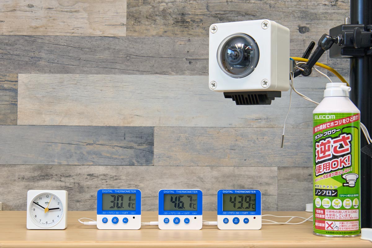 高出力産業用カメラを外形 80 × 80 × 60 mm の防水カメラハウジング(ASA樹脂)に組み込み、ヒートシンク装着状態での放熱効果について検証試験を実施しました。