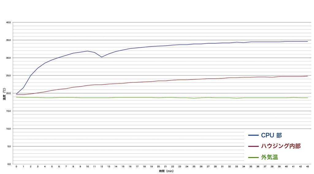 冷却システム無しの状態では、ハウジング内部の温度が下がることはなく緩やかに上昇していきました。