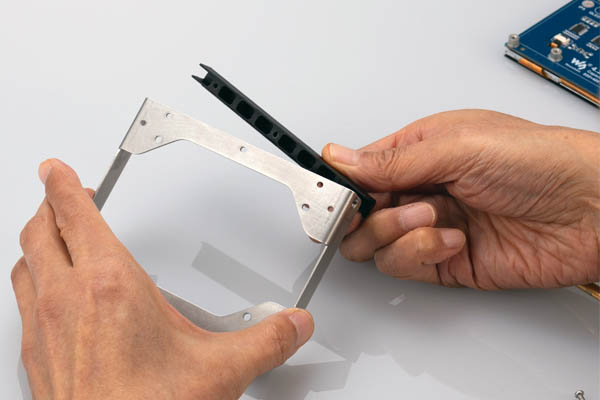 ハニカムケースにモニターを設置できるフレームは、Raspberry Pi 本体とタッチモニター(4.3インチ)をコンパクトに一体化するために設計された高利便性ブラケットです。