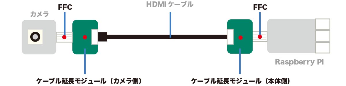 カメラ → FFC → CSI変換 → HDMIケーブル → CSI変換 → FFC → Raspberry Pi