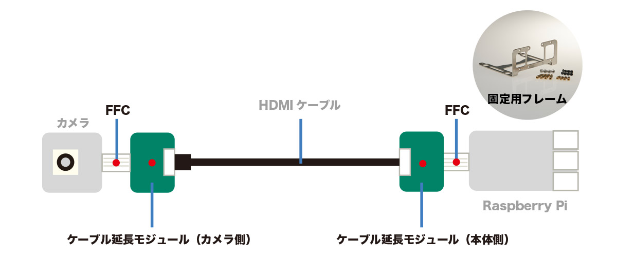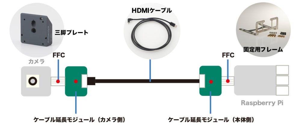 延長モジュールと固定用フレームに、動作確認済みのHDMIケーブル(1.5m)およびカメラマウントプレートを付属したセットです。